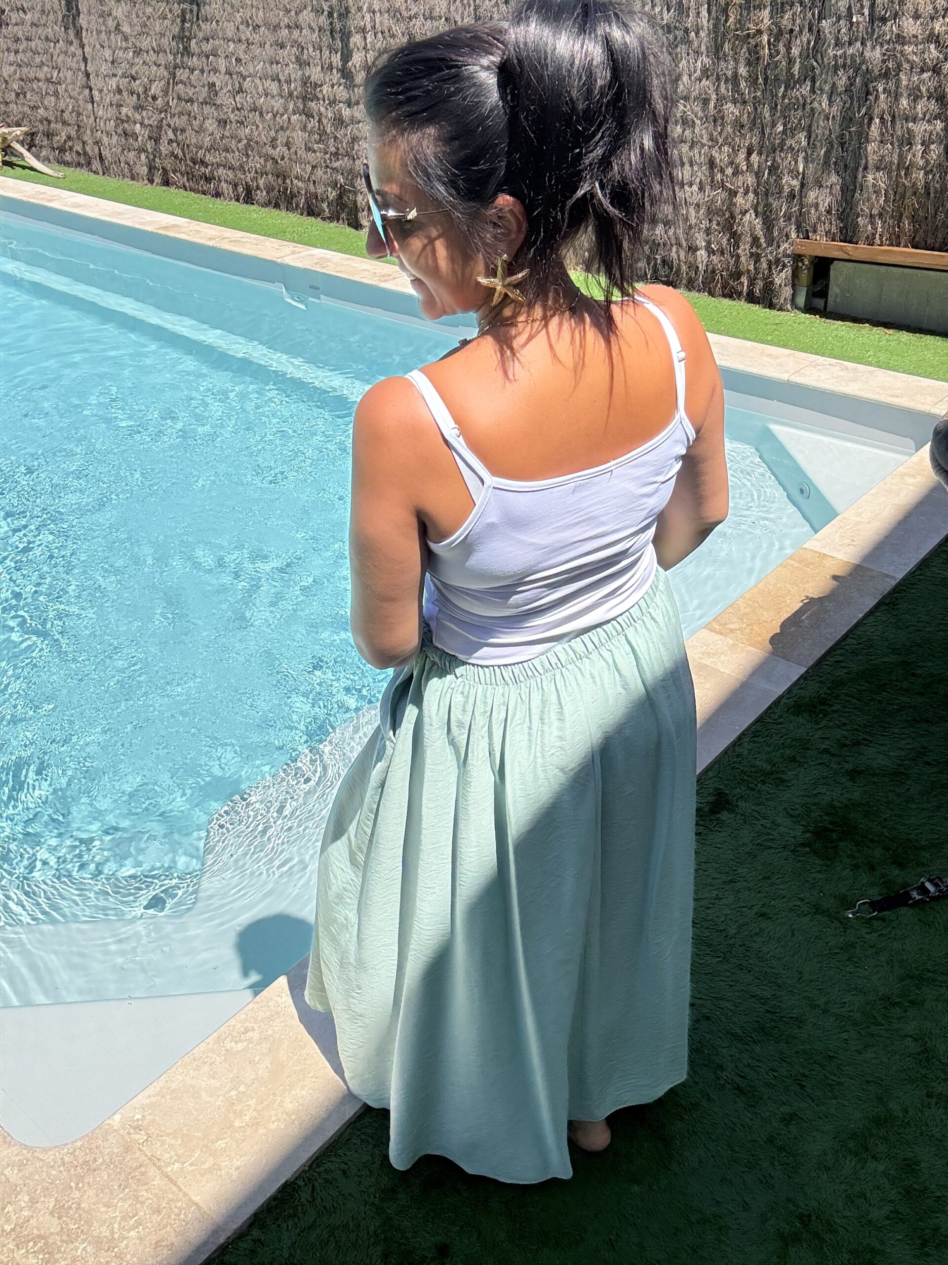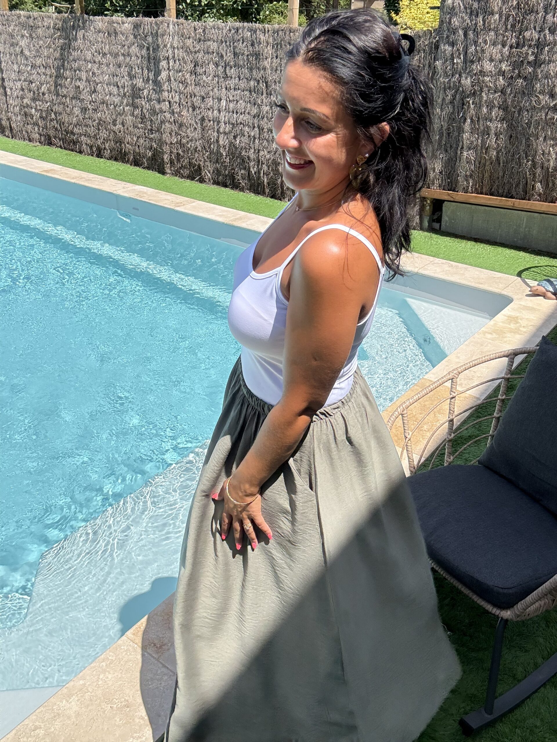 On craque pour cette jupe longue ultra fluide et confortable, parfaite pour twister tous tes looks d’été. Sa coupe ample et sa taille élastiquée en font un basique stylé et facile à porter au quotidien, que tu sois à la plage ou en ville.