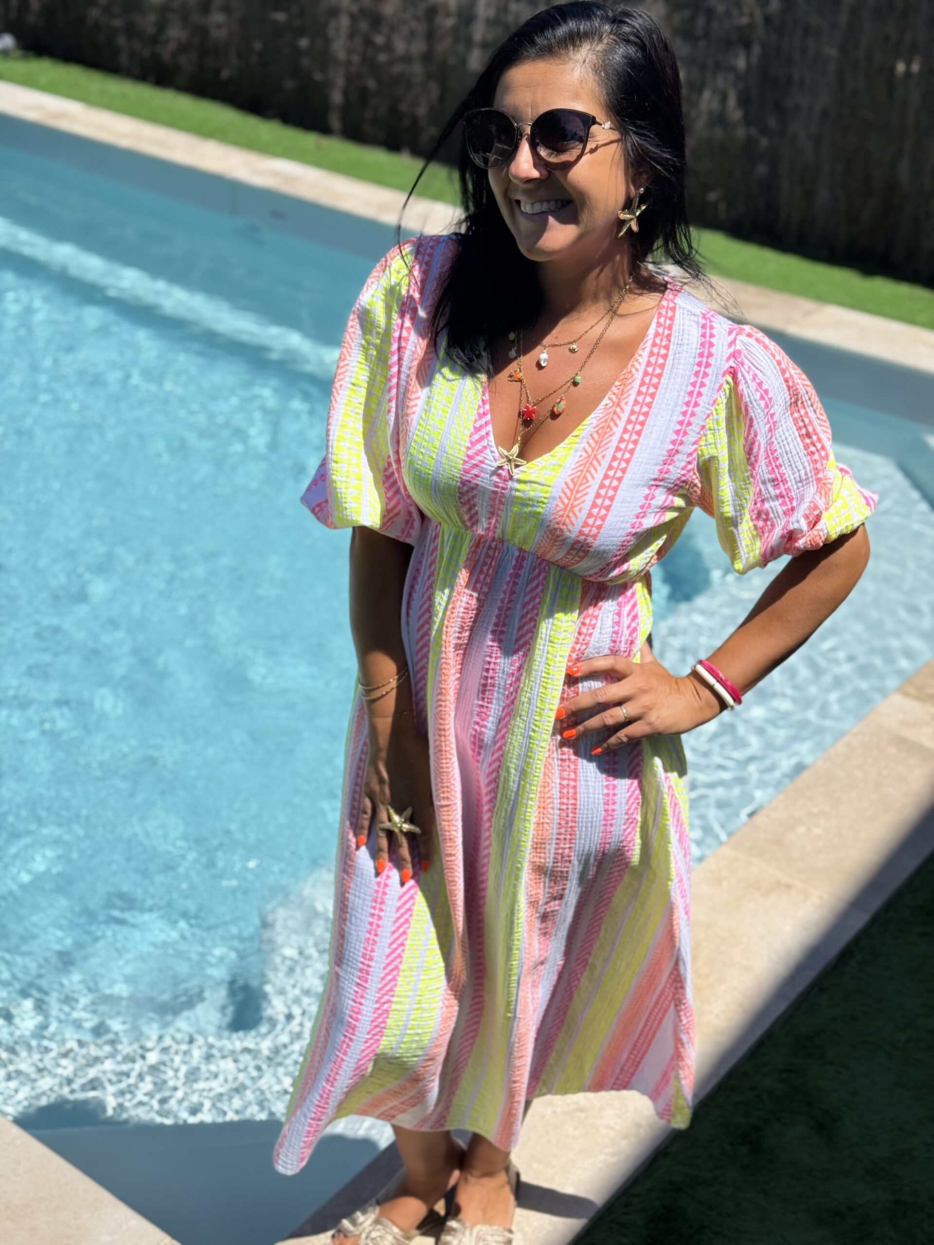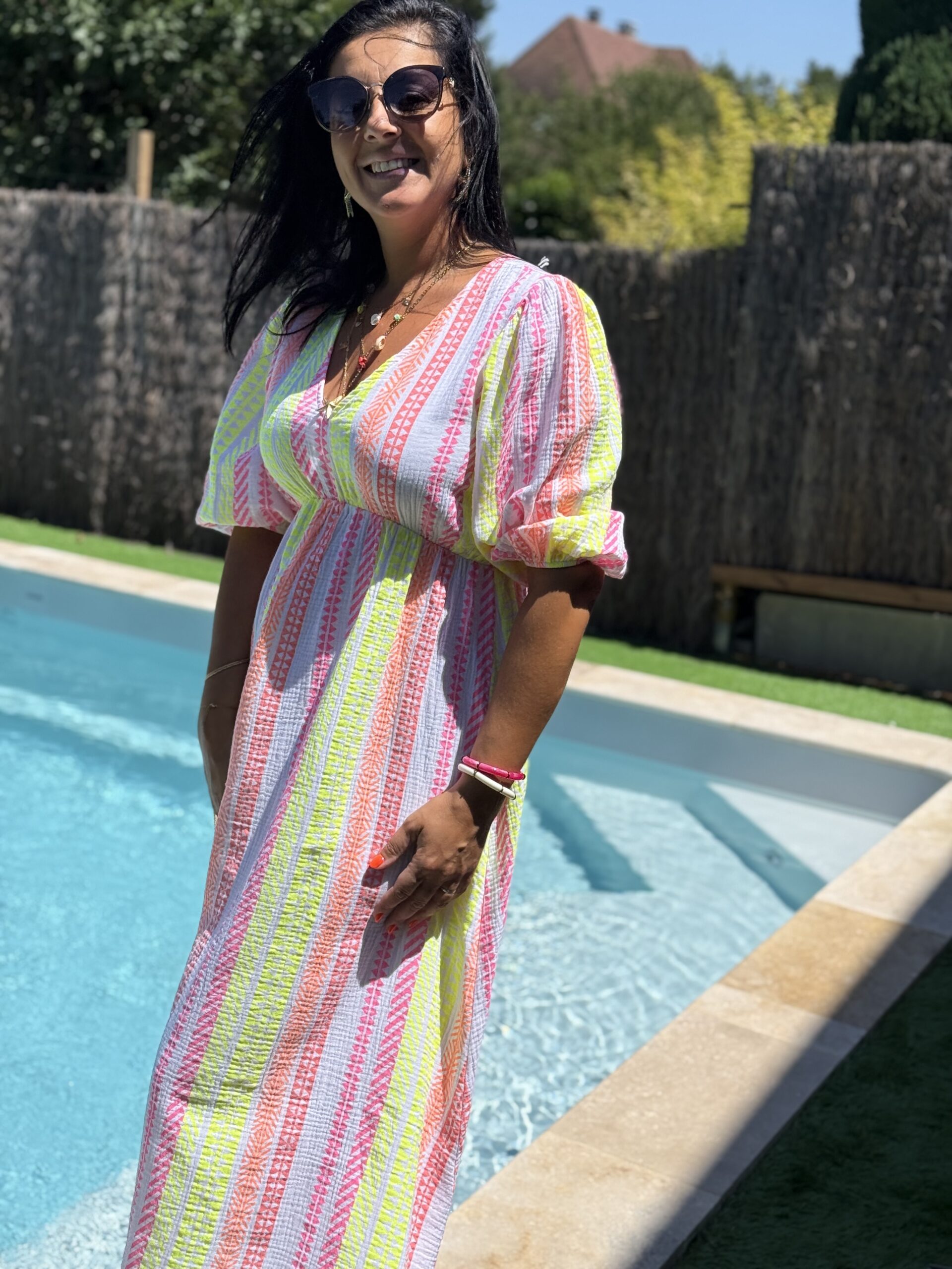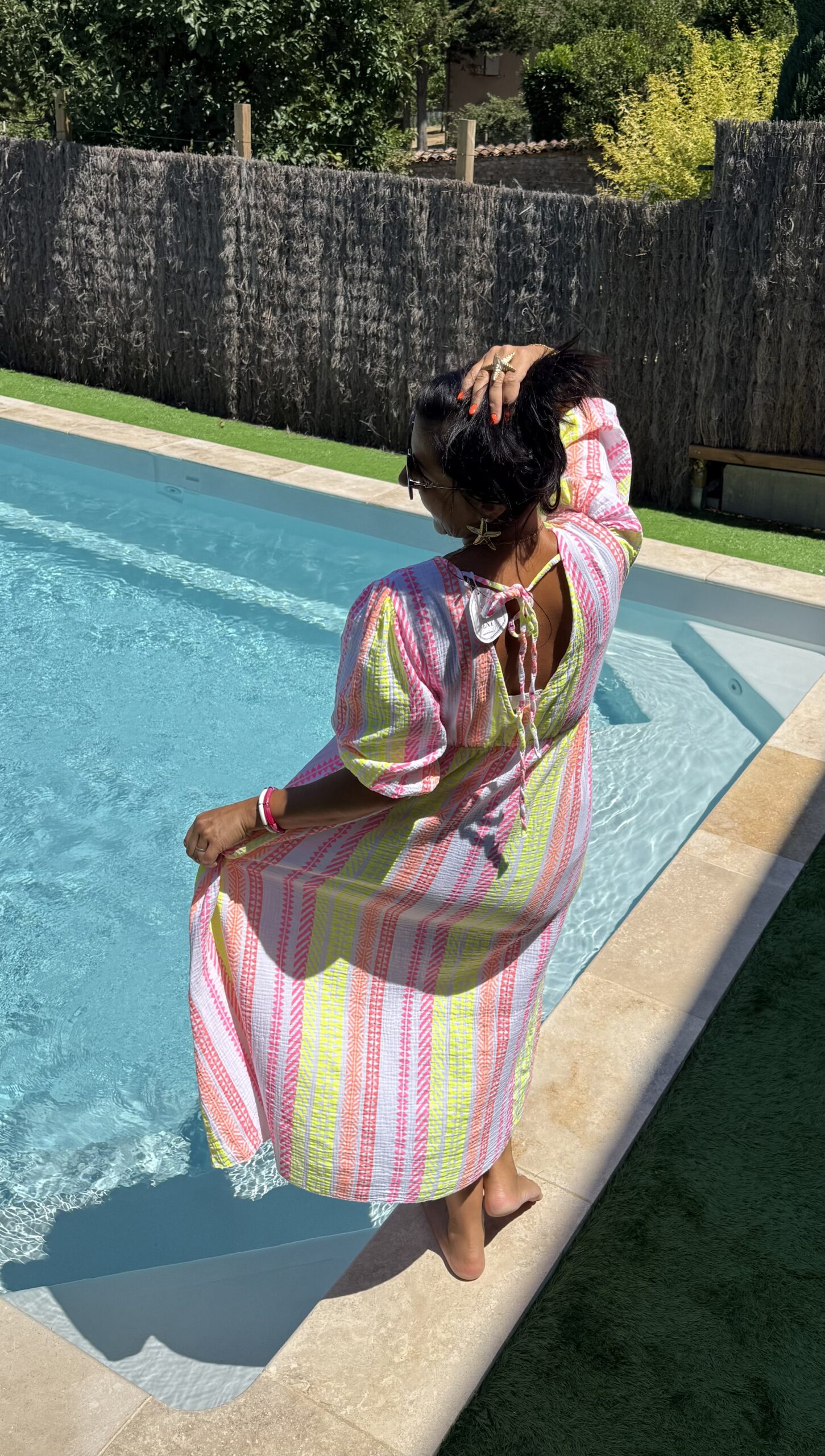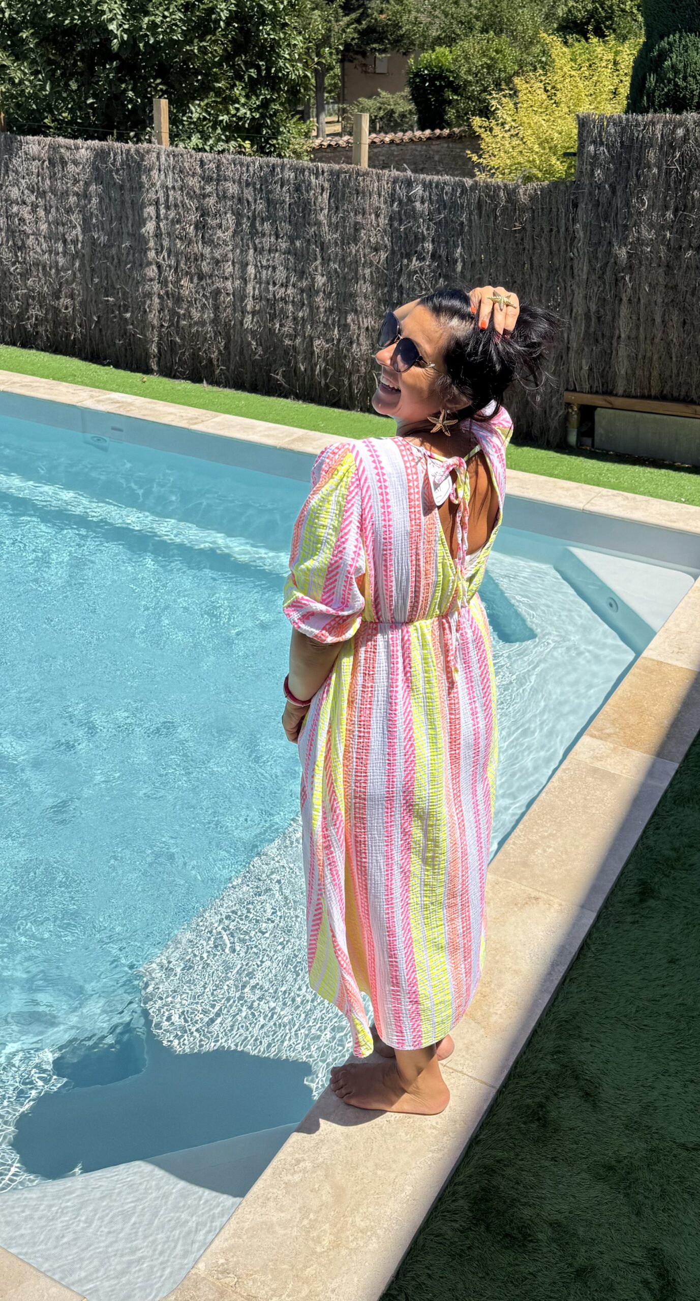 On craque pour ses rayures multicolores en rose fluo, corail, jaune citron et lilas, qui apportent instantanément bonne humeur et fraîcheur. Sa coupe fluide et son dos joliment noué la rendent aussi agréable à porter qu’elle est flatteuse. À enfiler après un plongeon ou pour un apéro les pieds dans l’eau